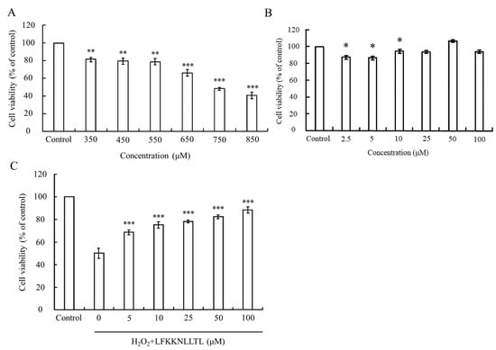 Figure 4. Evaluation of cell viability in HepG2 cells under oxidative stress and peptide treatment. (A) Viability of HepG2 cells treated with varying concentrations of H2O2. (B) Viability of HepG2 cells treated with different concentrations of the peptide. (C) Protective effect of the peptide against H2O2-induced cytotoxicity in HepG2 cells. The group without peptide and H2O2 treatment served as the blank. Data were presented as mean ± SD. Statistical significance was denoted as * p < 0.05, ** p < 0.01, and *** p < 0.001 compared to the blank in (A,B), and *** p < 0.001 compared to the 750 μM H2O2 treatment group in (C).