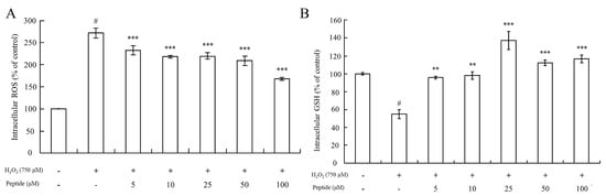 The production of reactive oxygen species (ROS) and the depletion of glutathione (GSH) are interconnected events that influence various signal transduction pathways regulating cell survival. Elevated ROS levels, coupled with decreased intracellular GSH content, contribute to mitochondrial dysfunction [50,51]. To elucidate the defense mechanism of the peptide against H2O2-induced cell injury in HepG2 cells, we assessed intracellular ROS and GSH levels using DCFH-DA and CMFDA, respectively.