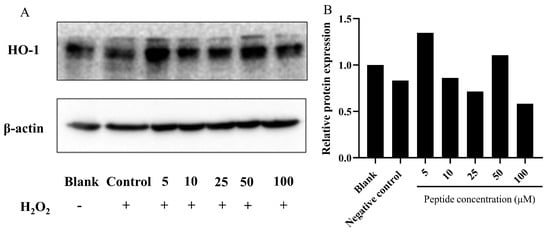 Heme oxygenase-1 (HO-1) is recognized as a cytoprotective protein, the expression of which is consistently linked to therapeutic benefits in various pathological conditions [54]. To elucidate the cytoprotective mechanism against oxidative stress induced by H2O2 in HepG2 cells, we analyzed the expression of phase II detoxifying enzymes such as HO-1 via Western blot analysis. As Figure 6 depicts, compared to the blank group (without H2O2 and peptide), HO-1 expression was slightly induced by treatment with H2O2 alone. However, pretreatment with the peptide in HepG2 cells notably upregulated the expression of HO-1. This suggests that the peptide could mitigate oxidative stress induced by H2O2 by stimulating HO-1 expression. Notably, similar actions of peptides isolated from M. edulis protein or sardine muscle on HO-1 expression have been extensively discussed in previous studies [55,56].