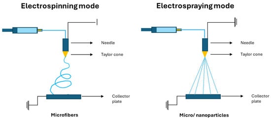 Schematic illustration of electrohydrodynamic technologies: electrospinning and electrospraying modes.