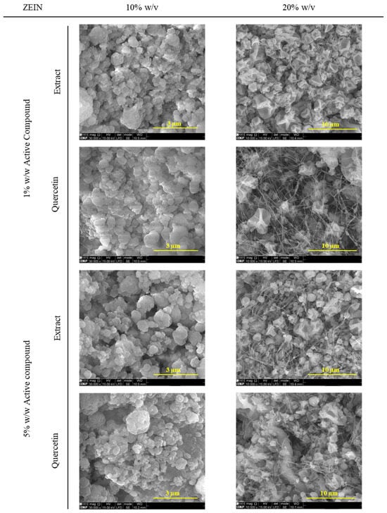 SEM images of microstructures containing the different concentrations of zein, extract, and quercetin. Magnification of 30,000× for samples with 10% w/v zein and 10,000× for samples with 20% w/v zein, a beam intensity (HV) of 15.00 kV, and a distance between the sample and the lens (WD) of less than 10.5 mm.