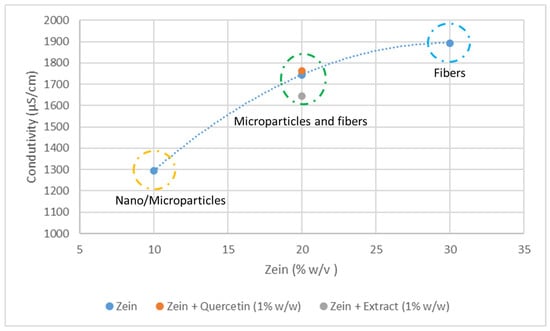 Therefore, at the higher zein concentration of 20% w/v, a distinct pattern emerges. The microstructures formed consist of a mixture of microparticles and thin fibers. These microparticles, although less wrinkled compared to the capsules formed at 10% w/v zein concentration, still exhibit heterogeneity in size. Curiously, the microparticles demonstrate an irregular surface, similar to possessing an outer layer that has undergone a collapsing phenomenon during the solvent evaporation process [34]. This unique characteristic suggests a potential structural transformation occurring during the fabrication process, possibly resulting from the interplay between zein concentration, solvent evaporation, and polymer self-assembly. The observed mixture of fibers and microparticles in the higher concentration samples is likely attributed to the increased resistance of these solutions to be drawn towards the collector during the electrohydrodynamic process or may be influenced by the electrical conductivity of the solution [35]. The electrical conductivity of the zein solution was evaluated and compared with the solutions containing quercetin and extract (Figure 3).