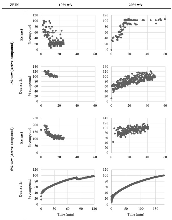 The samples containing 20% w/v zein exhibit better controlled release profiles, suggesting better encapsulation capacity and control. Moreover, the samples prepared with quercetin have a slower release compared to the ones prepared with the extract.