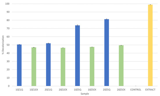 The antioxidant capacities of the F. vesca leaf extract and quercetin loaded on the zein microstructures were evaluated by the ABTS method. The analysis was performed, and the results are presented in Figure 5. The results are expressed as the percentage of decolorization.