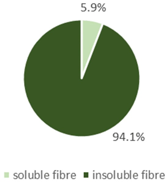 Matcha has a high content of dietary fibre, especially the insoluble fraction. The total fibre (TF) content of matcha was 56.1 ± 2.753 g/100 g, with 52.8 ± 2.611 g/100 g of insoluble dietary fibre (IDF) and 3.3 ± 0.141 g/100 g of soluble fibre. The percentages of the dietary fibre fractions are presented in Figure 1.