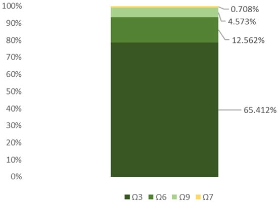 Of the unsaturated fatty acids, the omega-3 family was the most abundant omega family. The next most abundant family was the omega-6 family, followed by the omega-9 one, and the least abundant was the omega-7 family. Figure 2 shows the content of each omega fatty acid family in relation to the total fat content.