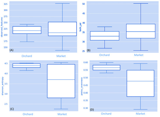 Alpha diversity among groups. Boxplots visualizing results of the nonparametric Kruskal–Wallis to compare the Observed features (A); Faith’s PD (B); Shannon diversity index (C); Pielou’s evenness (D). Legend: four: fruits collected from the orchard phase four; market: fruits purchased from the market stands.
