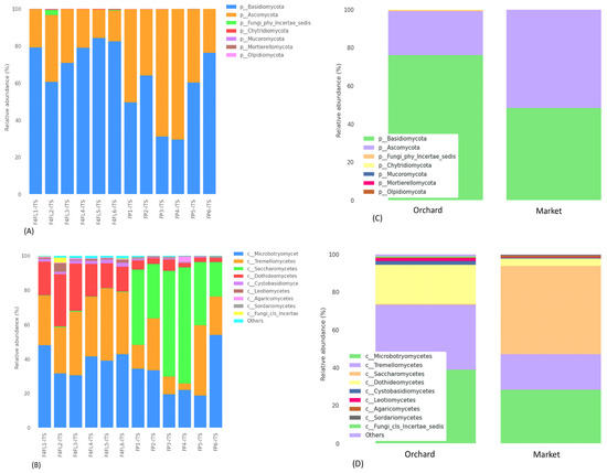 Relative abundance (%) of different fungal phyla and classes detected in strawberry fruits across the samples (A,B) and among the groups (C,D). Legend: F4L1-ITS: F4L6-ITS: fruits collected from the orchard; FP1-ITS:FP6-ITS: fruits purchased from the market. The “Other” category in this sum of all classifications with less than 0.50% abundance.
