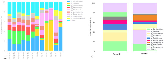 Fruits can be more storable and less susceptible to disease if their microbiomes are healthier and diverse. Early research indicates that during developmental stages, significant microbial fractions are transferred between different plant compartments [31]. Furthermore, as documented by Yan et al. [43], yeasts can colonize fruit surfaces for a prolonged duration; they can also inhibit the germination of pathogen spores and the length of the germ tube [44], induce a variety of defense-related enzyme activities that trigger host defense mechanisms, and assist in the biosynthesis of antimicrobial compounds [45]. Based on the abundance information of the main genera/species of all samples, a heatmap was drawn and the similarity and difference were shown (Figure 5). Similarly, the groups shared 91 (22.8%) genera and 128 (26.4%) species (Figure S3). Endophytic yeasts such as Curvibasidium cygneicollum were prevalent in strawberry samples regardless of the origin, except the market samples FP3-ITS and FP4-ITS (Figure 6A,B). C. cygneicollum was among the most common Basidiomycetes yeasts detected in stored fruits [46]. Interestingly, the predominant yeast species, such as Candida railenensis, was detected in fruits only from the market. Their relative abundance varies with the sample from 1.3% to 61.42%. C. railenensis was detected in grape berries and was the weakly ascomycetes associated with the fermentation to be used in the production of ice wine [47]. Likewise, Debaryomyces prosopidis was detected in samples from the market. From early analyses of fungal diversity in strawberries, these yeast species were not documented in ripe strawberry [11,31]. Thus, we suggest that might have something to do with the geographical origin, season, and the cultivar. Rhodotorula graminis (relative abundance varying from 1.7% to 21.18%) and Papiliotrema flavescens (relative abundance varying from 1.58% to 16.55%) were detected in all samples regardless of the origin, while Debaryomyces prosopidis was detected in samples from the market only, their relative abundance varying with the sample (0.80–19.23%) (Figure 6A,B). Previous studies indicate that R. graminis produces beta-carotene, torulene, and torularhodin to counteract ROS-induced cellular damage [48]. Additionally, Filobasidium globosporum was predominant in the samples from the orchard. Furthermore, although in lower abundance (0.9%) species of Colletotrichum were predicted in market-derived samples. Among them, C. acutatum, known as the leading cause of anthracnosis [49,50] in strawberries, was not detected in this study. Finally, a phylogenetic tree was built to reveal evolutionary relationships and biological diversity in a sequence data set (Figure S4).