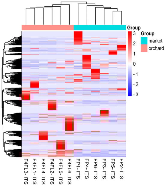 The analysis of similarities (ANOSIM) was used to test the hypothesis that there is no difference between the two groups of samples. The R test was employed to determine whether there are differences between the groups under the null hypothesis [28]. Additionally, to infer absolute microbial abundances, the taxa with significantly differential abundances were identified using ANCOM analysis [29]. A centered log ratio (CLR) transformation was applied to account for the compositionality of the microbiome data. The output W statistic indicates how many CLR-transformed models exist for a particular taxon in which the taxon is differentially abundant with the variable of interest. As the W value increases, the probability of a taxa being differentially abundant increases. To ascertain the similarities between the groups at the genus level, hierarchical clustering was carried out using the unweighted pair group method (UPGMA with Euclidean distance). In addition, Venn diagrams were drawn to investigate the intersection of the fungal genera and species between groups (orchard vs. market). A bioinformatic platform (https://www.bioinformatics.com.cn/en, accessed on 14 February 2024) was used to conduct these analyses.