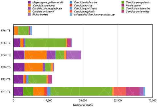 Clinical related yeasts species detected in samples purchased from the market (expressed as number of reads). Legend: FP1-ITS: FP6-ITS: fruits purchased from the market.