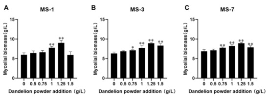 26]. In this study, 1.25 g/L dandelion powder significantly promoted the growth of