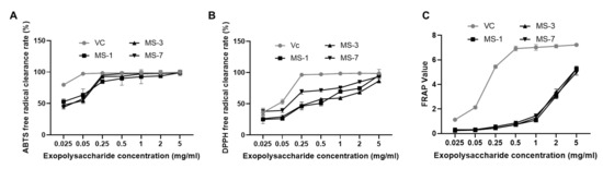 S. sanghuang extracellular polysaccharides is substantial. Within a certain concentration range, increasing the polysaccharide concentration can improve the scavenging ability of ABTS and DPPH free radicals. The antioxidant effects of the exopolysaccharide of the