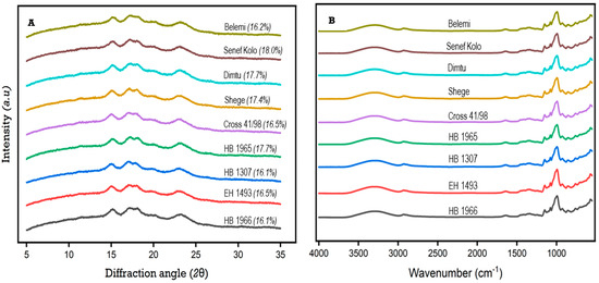 X-ray diffractograms (A) and FT-IR spectra (B) of starches isolated from Ethiopian food barley varieties.