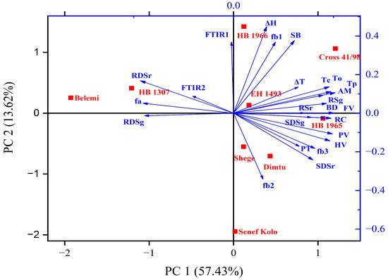 In order to better visualize and comprehend the relationship among barley varieties and their starch properties, a PCA analysis was conducted (Figure 2). The eigenvalues of the first six principal components were higher than 1, and PC1 and PC2 accounted for 71.1% of the variability among the samples. With 57.4% variability and an eigenvalue of 14.36, PC1 explained most of the variance, which was mainly associated with amylose content, crystallinity, in vitro digestibility, RVA peak values, gelatinization temperatures (To, Tp, Tc), fa, and fb3. PC2, on the other hand, was related to fb1, fb2, ΔH, and setback viscosity. The positions of the samples in the biplot chart revealed differences among the varieties. Notably, varieties like Belemi, HB 1307, and Senef Kolo exhibited clear separation, while EH 1493, Shege, and Dimtu were more similar to each other.