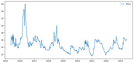 This research data came from the WeChat official account platform of “Ningde Larimichthys Crocea”, operated by the Fishery Association of Ningde City, Fujian Province, and selected the daily reference price for sea surface purchase of larimichthys crocea of 400–500 g published by the platform as the research object. The selected time period ranged from 13 May 2015 to 24 May 2023, and missing values were filled using the backward filling method. A total of 2948 daily price data points were collected, as shown in Figure 2.