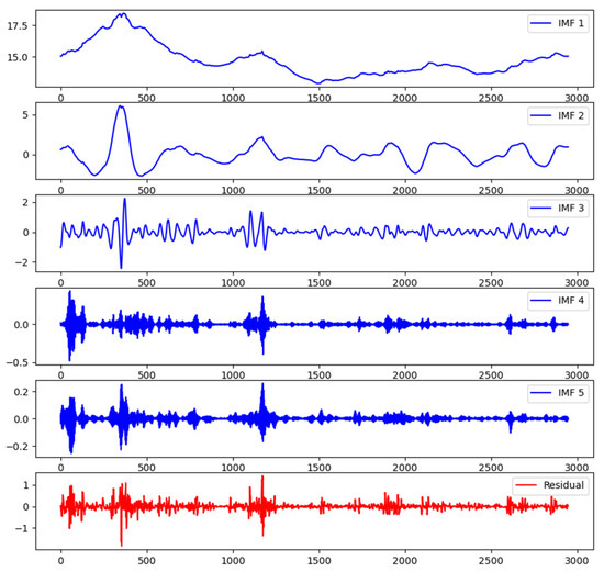 In VMD decomposition, the parameter K represents the number of decomposed modes. A value of K that is either too large or too small can result in excessive noise or loss of information, which adversely affects the accuracy of subsequent predictions. Therefore, when selecting VMD parameters, it is necessary to balance the relationship between the value of K and prediction accuracy. Generally, the optimal value of K can be determined through methods such as cross-validation to ensure that VMD effectively extracts the important oscillatory patterns from the data and establishes accurate models for subsequent data analysis and prediction. After conducting experiments, the final decision was made to set the value of K in VMD decomposition as 5. The decomposed IMF components are shown in the following Figure 3.