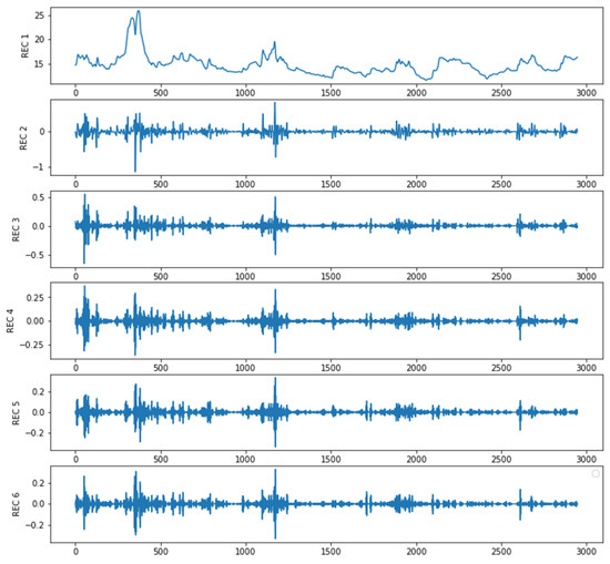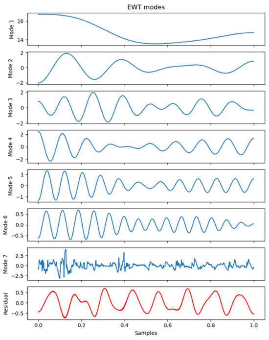 In this study, the EWT (empirical wavelet transform) algorithm was employed to decompose the original sequence. Subsequently, seven empirical mode components (EMCs) were obtained, as shown in the Figure 4. It can be observed that the EWT decomposition results exhibited a characteristic shift from low frequency to high frequency.