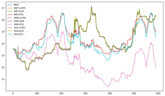 Secondly, it can be observed that the predictive accuracy of the models based on LSTM and ELM were higher than that of the ETS model. The main reason for this is that LSTM and ELM are artificial intelligence algorithms that excel in handling information contained in different components after decomposition. Generally speaking, they have stronger adaptability compared to linear models. Prediction models based on artificial intelligence algorithms are more suitable when combined with decomposition techniques. On the other hand, the ETS model is a complex nonlinear prediction model that is more suited for short-term trend forecasting. These findings indicate that the performance of decomposition techniques and prediction models tends to be diverse. Therefore, the combination of models is particularly important for mitigating the risk of model selection.