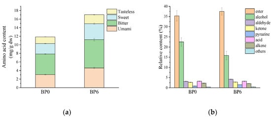 Free amino acids can form volatile flavor components, such as aldehydes, ketones, esters, and pyrazines, that are crucial for the distinctive flavor characteristics of fermented products, via the Maillard reaction and the Strecker amino acid-degradation reaction [25]. The content of total free amino acids (17.03 mg/g dw) and essential amino acids (7.01 mg/g dw) in BP6 were significantly higher than those in BP0 (p < 0.05) (Table 2). Among the 17 free amino detected, except for Cys, the content of most free amino acids increased during post-ripening fermentation. Glu (4.00 mg/g dw) was the most abundant amino acid and its content increased by 55.04% during fermentation. It has been reported that the glutaminase of Lactiplantibacillus can promote the accumulation of Glu and further increase the umami taste of fermented food [26].