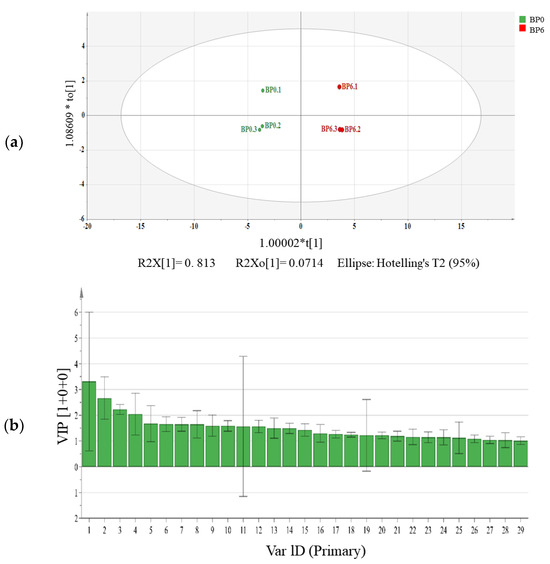 SPSS 26.0 software (SPSS Inc. Chicago, IL, USA) was used to evaluate significant differences (p < 0.05). The orthogonal projections to the latent structures–discriminant analysis (OPLS-DA) and variable importance of projection (VIP) were performed using SIMCA 14.1 software (Umetrics, Umea, Sweden). OPLS-DA is a supervised pattern-classification and -identification method that can accurately characterize intergroups between samples [18]. The VIP value can reflect the extent to which variables contribute to the model [19].