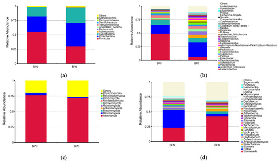 A total of 386,360 16S rDNA and 443,161 ITS rDNA valid sequences were obtained from the chili bean paste, of which 1912 bacterial and 1743 fungal OTUs were identified at a concordance threshold of 97%. As shown in Table S2, Shannon and Simpson indices showed that the bacterial diversity in chili bean paste increased while fungal diversity decreased. Both Simpson and Shannon indices of bacteria in BP6 were higher than those of fungi. In addition, the Chao1 and ACE indices of bacteria and fungi were reduced, which may be related to the competition of dominant strains during fermentation.