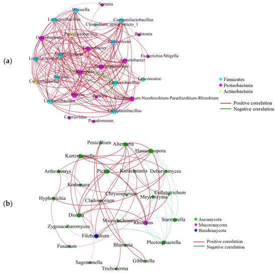 To explore the microbial interaction during the post-ripe fermentation of chili bean paste, a Pearson correlation (|r| > 0.6) was used to analyze the positive and negative correlations among the top 30 dominant bacterial genera by abundance (Figure 5a,b). Positive and negative correlations represented potential symbiotic and antagonistic relationships between genera. The results of the correlation analysis showed that Lactiplantibacillus, Paucilactobacillus, Enterobacter, Pediococcus, and Weissella were positively correlated with each other (Figure 5a). These genera of bacteria are key contributors in the production of fermented foods such as soy sauce and cheese [46]. However, Latilactobacillus was negatively correlated with Paucilactobacillus, Enterobacter, Loigolactobacillus, Weissella, Lacticaseibacillus, and Lactiplantibacillus, suggesting that the growth and metabolism of Latilactobacillus and other bacterial genera may have been mutually inhibited. This could explain the aforementioned decrease in the relative abundance of Latilactobacillus. In addition, Lacticaseibacillus was negatively correlated with Pantoea and Serratia. Lacticaseibacillus inhibits the growth of other microorganisms by producing organic acids and antibiotics, and competes for nutrients [47]. Li et al. [48] also demonstrated the important role of community composition and the quantity of microorganisms in low-salt fermented-red-pepper sauce. Levilactobacillus, Companilactobacillus and Candida were the dominant genera, and Levilactobacillus was significantly negatively correlated with Lactiplantibacillus, Weissella and Enterococcus. Except for Plectosphaerella and Starmerella, which were negatively correlated with other fungal genera, most fungal genera were positively correlated (Figure 5b). Rhizopus was positively correlated with Pichia, Filobasidium, Alternaria, and Hanseniaspora. Interactions between bacterial communities were stronger than those in the fungal communities in the chili bean paste. The interaction between these microorganisms constitutes the biological regulatory mechanism in the fermentation process, which maintains the natural steady-state fermentation and dynamic equilibrium of the entire fermentation system.