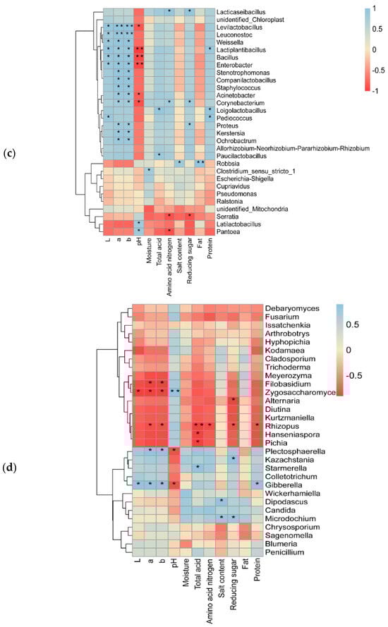 The correlations between the dominant bacterial and fungal genera (top 30 genera) and physicochemical indices during the post-ripening fermentation of chili bean paste are shown in Figure 5c,d. At the bacterial genus level (Figure 5c), Lactiplantibacillus, Bacillus, Enterobacter, Acinetobacter, Corynebacterium, and Levilactobacillus showed a significant negative correlation with pH. Lacticaseibacillus was significantly positively correlated with amino acid nitrogen and reducing sugars. Lacticaseibacillus converts starch to glucose via an amylase enzyme [49]. Most of the dominant bacterial genera were positively correlated with color, indicating that microbial action had an important effect on the color of chili bean paste. The correlation between fungi and the physicochemical indicators of the chili bean paste was in sharp contrast to that of bacteria (Figure 5d). Rhizopus, Hanseniaspora, and Pichia were significantly negatively correlated with total acid, while positively correlated with pH (p < 0.05). Zygosaccharomyces is the main genus of fungi tolerant to low pH during the development of bean paste [3]. In the present study, Zygosaccharomyces was found to have a significant positive correlation with pH (p < 0.05), which could be explained by the alcoholic fermentation. Candida ferments glucose and is positively correlated with reducing sugars, and was the dominant fungus affecting flavor production [50].