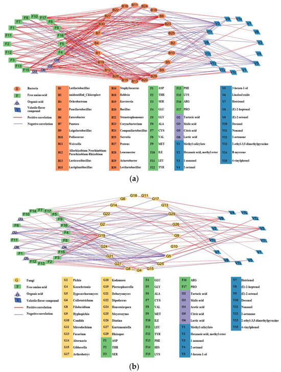 The network correlation between microbial genera and flavor compounds in chili bean paste. (a) stands for bacteria genera; (b) stands for fungi genera. Red and violet lines represent positive and negative correlation coefficients, respectively. (|r| > 0.6, p < 0.05).