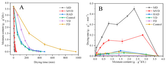 Altogether, the drying rates of 6 drying methods showed a decreasing trend, and there was no obvious constant-rate drying stage. Consequently, this indicated that the diffusion and migration of water in the sample determined the drying rate. The drying rates for MD and MVD methods were significantly higher than they were for the other samples, since the heat source was microwaves that directly penetrate the sample. The microwave energy can be rapidly absorbed by water molecules to achieve the effect of balanced internal and external heating, thus having the same heat and mass-transfer direction, which is more conducive to the evaporation of water [19]. Compared with MD, the vacuum condition in the MVD method did not expose the samples to high temperature, better retaining the original shape and color of the sample and acting as an efficient and high-quality drying technique.