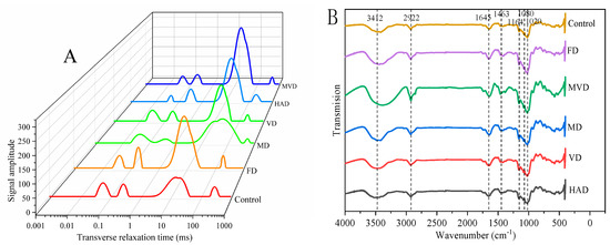 T2 inversion spectra (A) and FT−IR spectra (B).