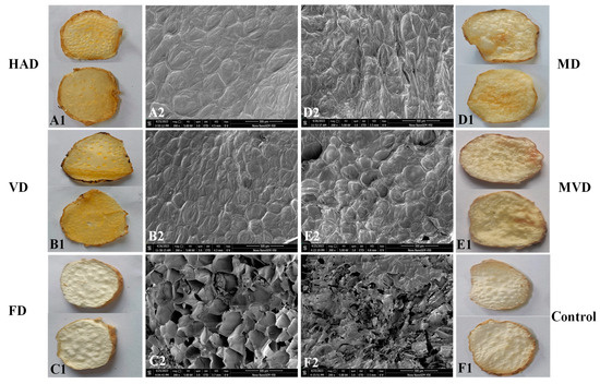 Ultimately, this view has also been confirmed in the context of the other drying properties. For example, the HAD method resulted in samples with a compact and intact cellular structure. Likewise, the VD samples exhibited a similar appearance with more tightly arranged cells under the dual effects of temperature and pressure. Meanwhile, the MD and MVD samples showed obvious fractures and holes on the surface, with severely damaged and disordered cellular structures, probably due to microwave disruption of cellular tissues. The FD samples showed uniform honeycomb pores due to the sublimation of ice crystals into water vapor, which left voids with a sponge-like porous structure in the cells [26]. In general, other reports have also suggested that these microscopic cavities could enhance the content of active ingredients extracted from the samples, which led us to analyze differences in active compounds [27].