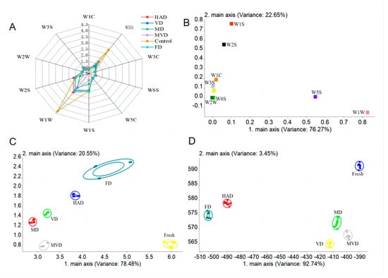 In order to further assess the differences in volatile compounds among the samples, we performed PCA and LDA analysis of the E-nose data. PCA performs data downscaling on the response signals, whereas LDA accounts for the class of the sample based on all the response signals [38]. In Figure 4C, the contribution of PC1 and PC2 were 78.48% and 20.55%, respectively, with a total contribution of 99.03%, which was able to express the different G. elata samples well. There was no overlap between the samples, which suggests that the G. elata samples exposed to different drying methods all had unique flavor components. The unsteamed samples and FD samples were farther away from the other samples, which implies that steaming and low temperatures change the content and type of volatile compounds in G. elata. Meanwhile, the VD and MD samples were very close to each other, which suggests that the overall difference in volatile composition of the samples was relatively small and share commonalities. In Figure 4D, the contributions of the linear discriminant functions, LD1 and LD2, were 92.74% and 3.45%, respectively, with a total contribution of 96.19%. The samples can all be distinguished, which was consistent with the results from our PCA analysis. Together, these data imply that there are some differences in volatile components between the PCA and LDA analysis. Together, these results are similar to those of different drying methods that were investigated for ginger [39]. However, the reason for the differences may be the formation of new volatile compounds with the different drying conditions [40].