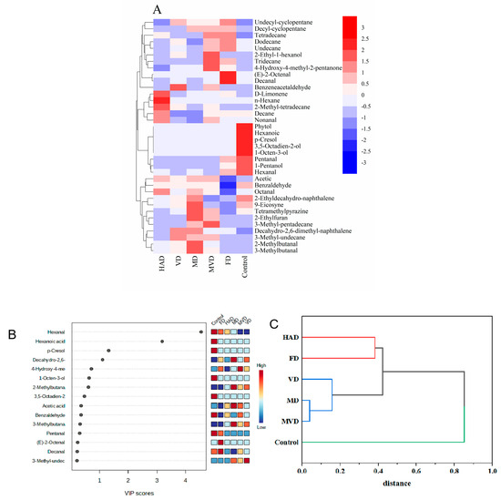 Multivariate statistical analysis of different drying method by HS-SPME-GC-MS identified volatiles on G. elata powder. Heatmap cluster based on the normalized quantities of the identified volatiles (A); VIP scores in PLS−DA (B); Cluster analysis diagram (C).