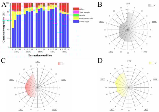 The chemical composition (A) and colorimeter analysis (B–D) of SWESPs. The solvent/solid ratio and extraction pressure were 40 mL/g and 5 MPa, respectively.