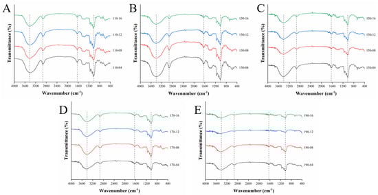 FT−IR spectrum analysis of SWESPs. (A) Extraction at 110 °C for different times (4, 8, 12, 16 min). (B) Extraction at 130 °C for different times (4, 8, 12, 16 min). (C) Extraction at 150 °C for different times (4, 8, 12, 16 min). (D) Extraction at 170 °C for different times (4, 8, 12, 16 min). (E) Extraction at 190 °C for different times (4, 8, 12, 16 min). The solvent/solid ratio and extraction pressure were 40 mL/g and 5 MPa, respectively.