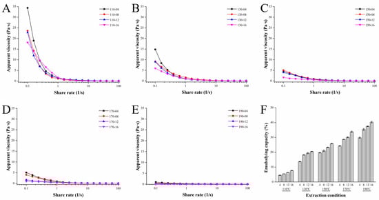 Analysis of the rheological (A–E) and emulsifying properties (F) of SWESPs. (A) Extraction at 110 °C for different times (4, 8, 12, 16 min). (B) Extraction at 130 °C for different times (4, 8, 12, 16 min). (C) Extraction at 150 °C for different times (4, 8, 12, 16 min). (D) Extraction at 170 °C for different times (4, 8, 12, 16 min). (E) Extraction at 190 °C for different times (4, 8, 12, 16 min). The solvent/solid ratio and extraction pressure were 40 mL/g and 5 MPa, respectively.
