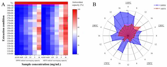 DPPH and ABTS radical scavenging activities (A) and in vitro IC50 value (B) of SWESPs. The extraction temperature ranged from 110 to 190 °C and the extraction time ranged from 4 to 16 min, which led to 20 combinations marked by “number1–number2”. The solvent/solid ratio and extraction pressure were 40 mL/g and 5 MPa, respectively.