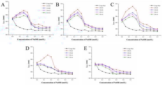 Maximum absorption λmax of SWESP–Congo red complexes at different concentrations of NaOH. (A) Extraction at 110 °C for different times (4, 8, 12, 16 min). (B) Extraction at 130℃ for different times (4, 8, 12, 16 min). (C) Extraction at 150 °C for different times (4, 8, 12, 16 min). (D) Extraction at 170 °C for different times (4, 8, 12, 16 min). (E) Extraction at 190 °C for different times (4, 8, 12, 16 min). The solvent/solid ratio and extraction pressure were 40 mL/g and 5 MPa, respectively.