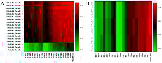 The GI at different times (A) and the predicted GI (B) of gelatinized wheat flour and gelatinized wheat flour/SWESP mixtures. The extraction temperature ranged from 110 to 190 °C and the extraction time ranged from 4 to 16 min, which led to 20 combinations marked by “number1–number2”. The solvent/solid ratio and extraction pressure were 40 mL/g and 5 MPa, respectively.