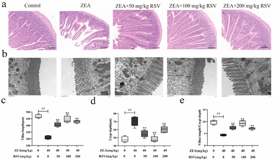 Effect of RSV on restoring intestinal epithelial injury in ZEA-treated mice. (a) H&E staining, ×100 of jejunum tissue. (b) TEM, ×10,000 of jejunum tissue. (c–e) Measurements were taken to determine the villi’s height, the crypts’ depth, and the ratio of villus length to crypt depth in the jejunum (n = 6). Values are presented as the mean ± SD of each treatment. “##” p < 0.01 compared to control group; “**” p < 0.01 compared ZEA group.