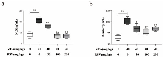 Effect of RSV on intestinal permeability in mice treated with ZEA. (a) The serum DAO, and (b) The serum D-lactate (n = 6). Values are presented as the mean ± SD of each treatment. “##” p < 0.01 compared to control group; “*” p < 0.05 and “**” p < 0.01 compared ZEA group.