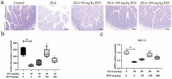 To investigate how RSV impacts the chemical barrier of the intestine affected by ZEA in mice, we assessed the number of goblet cells and the proportion of MUC-2 mRNA expression in the epithelium of the jejunum. The results showed that RSV supplementation reversed the ZEA-induced decrease in the jejunal goblet cell number. (Figure 3a,b). Similarly, RSV reversed the ZEA-induced reduction in MUC-2 mRNA expression in the jejunum (Figure 3c).