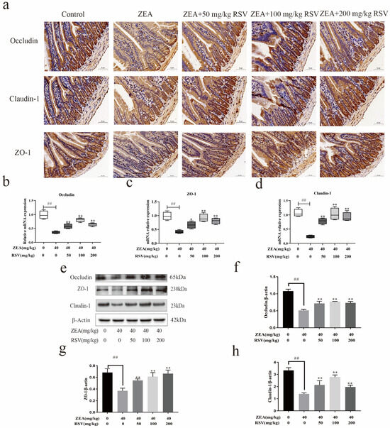 To investigate how RSV impacts the physical barrier created by ZEA in the jejunum of mice, the levels and localisation of occludin, claudin-1, and ZO-1 proteins were analyzed. An analysis using qRT-PCR and Western blotting showed that exposure to ZEA decreased the levels of occludin, claudin-1, and ZO-1 in the intestines compared to the control group. Elevated levels of occludin, claudin-1, ZO-1 mRNA,3, and protein were observed following RSV pre-treatment (Figure 4b–h). Immunohistochemical analysis indicated that ZEA caused a significant decrease in the protein expression of ZO-1, occludin, and claudin-1, while RSV effectively mitigated these impacts.
