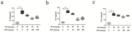 Effect of RSV on serum cytokines in ZEA-exposed mice (n = 6). ELISA was used to evaluate the concentrations of (a) TNF-α, (b) IL-1β, and (c) IL-6 in the serum of mice. Values are presented as the mean ± SD of each treatment. “##” p < 0.01 compared to control group; “*” p < 0.05 and “**” p < 0.01 compared ZEA group.