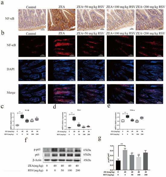 Impact of RSV on the NF-κB signalling pathway during ZEA-induced intestinal inflammation in mice. (a) Immunohistochemical analyses of NF-κB (magnification: 100× and scale bar: 50 μm). (b) Immunofluorescence analysis of NF-κB p65 in the jejunum (magnification: 400×; scale bars: 20 μm). (c–e) The mRNA expression levels of TNF-α, IL-1β, and IL-6 in the jejunum were compared (n = 6). (f,g) Western blot images representative of and quantification of p-NF-κB p65 and NF-κB p65 (n = 3). DAPI was used as the nuclear counterstain. Values are presented as the mean ± SD of each treatment. “##” p < 0.01 compared to control group; “*” p < 0.05 and “**” p < 0.01 compared ZEA group.