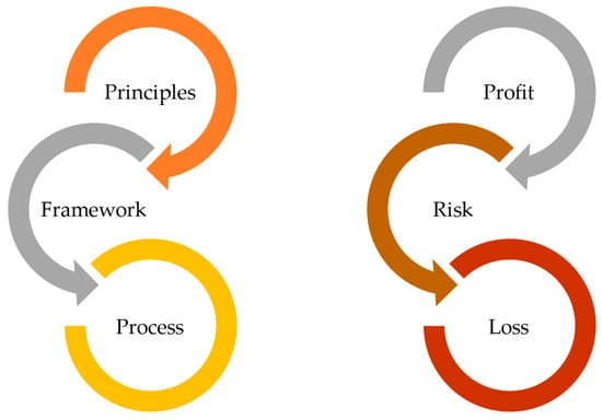 Figure 4 illustrates an analysis of ethics in terms of principles, framework, and processes, as outlined in ISO 31000:2018, and connections with profit, risk, and loss [165].