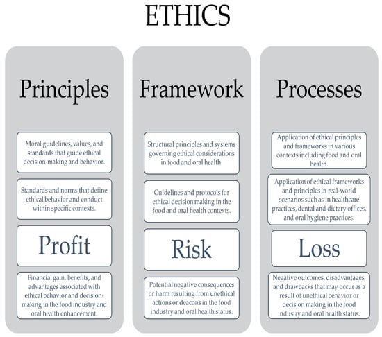 Then, in this review study, we employed a methodological approach that encompasses several key steps aligned with the theme of the ethical dimensions inherent in various facets of the food system. Firstly, we selected databases that cover a wide range of disciplines relevant to the topic, including PubMed, Web of Science, Scopus, and Google Scholar. Next, we developed a comprehensive search strategy using relevant keywords and phrases related to food ethics, sustainability, morality, and related concepts. We considered using a combination of controlled vocabulary (e.g., MeSH terms in PubMed). In this sense, for “sustainability of systems through food”, we used the following terms: food supply/supply and distribution, food industry/economics, food preservation/methods, food handling/methods, food technology/methods, food packaging/methods, sustainable agriculture/methods, agriculture/economics, environmental sustainability, and conservation of natural resources. For “health economics“, we used the following terms: “health economics”, “health expenditures”, “healthcare costs”, “cost-benefit analysis”, “cost control”, “economic models”, “health services accessibility”, “health policy”, “health insurance”, and “managed care programs”. Also, for “oral health” issues, we used the following terms: “oral health”, “dental health services”, “dental health surveys”, “periodontal diseases”, “tooth diseases”, “dental caries”, “oral health promotion”, and “dental public health”. Finally, we searched additional free-text terms such as “food ethics”, “ethical production”, “food sustainability”, “food morality”, “ethical consumption”, “food waste ethics”, “animal welfare”, environmental ethics”, “oral health”, “general health”, and “diet habits”. In the end, we linked ethics with food consumption behavior.