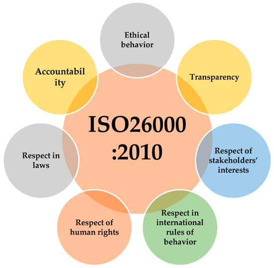 Furthermore, ISO 26000:2010 provides “guidance on social responsibility”, meaning how businesses and organizations can operate in a socially responsible way and refer to principles of social responsibility related to accountability, transparency, ethical behavior, respect for human rights, respect for stakeholders’ interests, respect for the rule of law, and respect for international norms of behavior. The general principles of ISO 26000 are described in Figure 7.