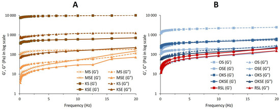 Viscoelastic moduli of plant-based creams with higher fat content (part (A)) and creams with a lower fat content (part (B)) in frequency range of 0.1–20 Hz. Samples without emulsifier are represented by dashed lines; samples with emulsifier are represented by solid lines. Data of elastic modulus G′ are depicted by cross symbols (×) or full squares (■); data of viscous modulus G″ are depicted by full triangles (▲).